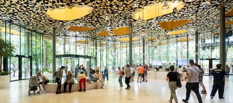 Sou Fujimoto’s creation defies definition: part concert hall, part interactive museum, part sanctuary. The structure refuses to impose itself on the park—instead, it nestles into it. From a distance, it appears like a shimmering pool of sound, as if music had liquefied and settled gently among the elms.